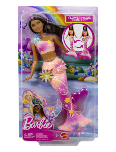 Blomstrende sjov med Barbie Flower Magic Mermaid-dukken! Skub håndtaget på hendes ryg for at se blomster 'blomstre' på magisk vis fra hendes overdel til hendes finner, igen og igen! Børn kan lege med hende på land og under vandet, så de kan se hende blomstre i solen eller i havet. Med sine iriserende blomster, ombre-finner og perlepandebånd i sit lange brune hår med smukke lilla striber er denne Barbie havfruedukke lige så fortryllende som en undersøisk have. Dukken kan ikke stå eller svømme alene. Farver og dekorationer kan variere.