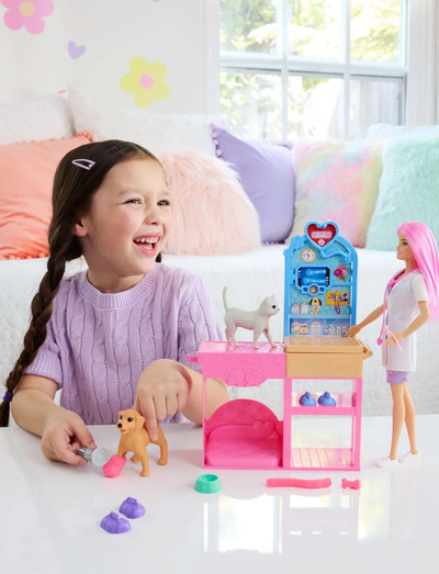 Udforsk en verden, hvor du tager dig af dyr med Barbie Fast Cast Veterinarian Clinic-legesættet! Kun fantasien sætter grænser, når du leger med Barbie og alle dem, der elsker at tage sig af deres pelsvenner kan blive dyrlæger! Klinikken indeholder en Barbie-dukke med pink hår, 2 kæledyr, et undersøgelsesbord og dyrlægetilbehør! Børnene kan lave gips til deres dyrepatient med en naturtro gipsfremstillingsfunktion til patientens arme og ben og lægge en forbinding med bandageapparatet! Børn vil elske at tage deres dyrevenner med til klinikken og få dem sunde og raske hjem igen! Dukken kan ikke stå af sig selv. Farver og mønstre kan variere. En fantastisk gave til børn fra 4 år.