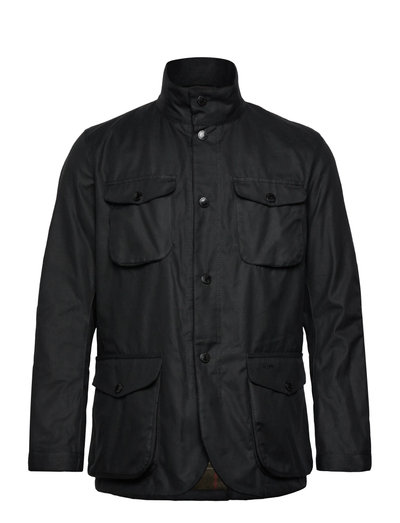 Heavyweight wax four pocket tailored shape with integral stand collar inner vest. Leather elbow pocket with tartan wool and corduroy lining.