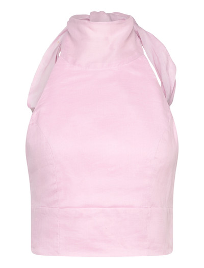 Denne ærmeløse top er fremstillet af letvægtsramie og har en høj halsudskæring med fine bindebåndsdetaljer. De rene linjer og den subtile tekstur gør den til en alsidig tilføjelse til enhver garderobe.