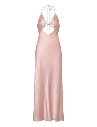 Denne maxikjole er fremstillet med en halterneck og giver en sofistikeret silhuet. Den har en udskæring foran og et flydende skørt, der er perfekt til særlige lejligheder.