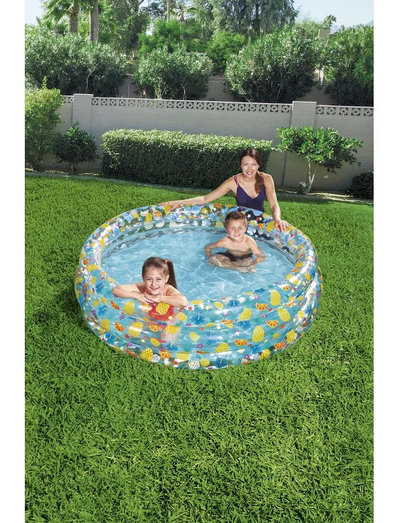 Colourful fruit-patterned swim ring has three rings and its size is 53 x 170 cm. Water capacity is 697 litres. The package includes a pool and a repair patch. 6+