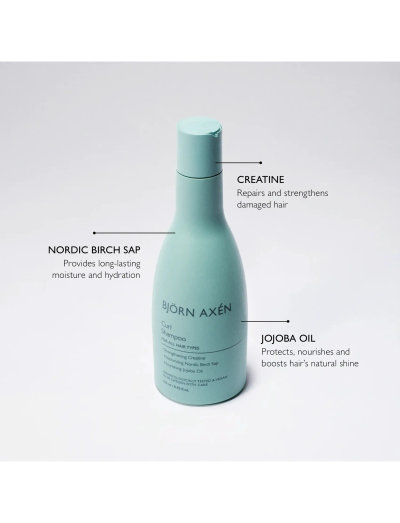 Dybt fugtgivende shampoo, beriget med Kreatin, Nordisk Birkesaft og Jojobaolie, der reparerer, fugter og nærer håret, så det bliver glansfuldt, spændstigt og med definerede krøller.