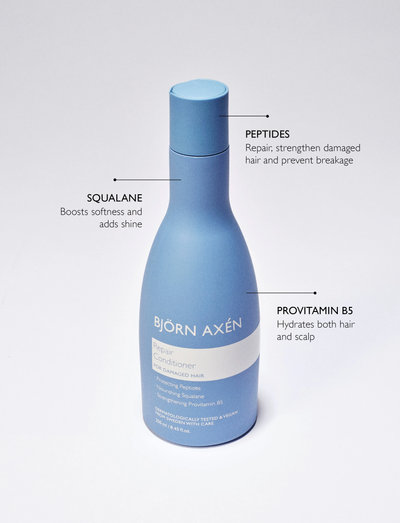 Balsam, der er beriget med Peptider, som reparerer og styrker skadet hår ved at forbedre elasticiteten og forhindre hårets bindinger i at brydes. Repair Conditioner indeholder også Squalane, der giver blødt og glansfuldt hår, og Provitamin B5, der tilfører fugt til både hår og hovedbund. Får håret til at syne blødere og føles sundere og stærkere – og naturligt glansfuldt.