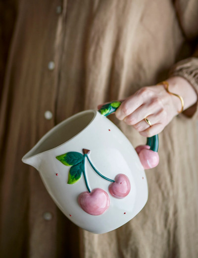 Berrie Kanden fra Creative Collection er fremstillet i stentøj med en blød rosafarvet glasur, kirsebærmotiver og fine bladdetaljer, Håndtaget er mørkegrønt og ender i en kirsebærknop, Da den er håndmalet, kan der forekomme små variationer i mønster og farvenuance, hvilket gør hver kande unik,