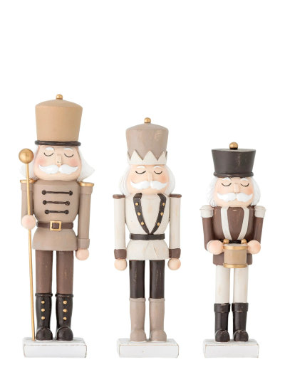 Darryl Deko fra Bloomingville er et sæt med tre charmerende dekorationer fremstillet i polyresin. Figurerne forestiller klassiske nøddeknækkere i smukke, neutrale farver og detaljerede udformninger, der bringer en nostalgisk og elegant stemning til juleudsmykningen. Perfekte til at placere på hylder, borde eller som en del af en større juledekoration for at skabe en hyggelig atmosfære.