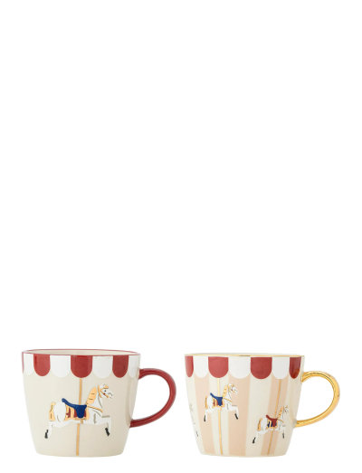 Merry-go-round Kruset fra Bloomingville er et charmerende sæt med to kopper, dekoreret med et festligt karruselmønster. Motiverne er håndmalede, og den ene kop er udstyret med en smuk guldeffekt på hanken. Perfekte til at nyde varme drikke og skabe hygge i juletiden. De håndmalede detaljer giver hvert krus et unikt udtryk.
