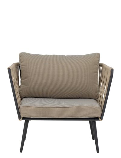 Pavone Loungestolen fra Bloomingville er designet med et let nordisk look og smukke detaljer. Den er lavet af pulverlakeret sort metal med lysebrunt polyesterreb håndvævet på stellet. De matchende beigebrune pudebetræk er lavet af polyester og kan vaskes ved 30 grader. Havestolen er velegnet til alle udendørsarealer, men ved at beskytte sofaen mod direkte sollys forlænges stoffets farve og sofaens holdbarhed. Nyd en smuk udendørs loungestol med høj komfort.