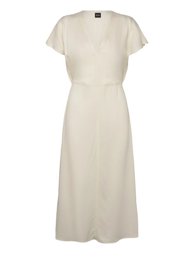 Denne kjole er fremstillet med en flatterende V-udskæring og giver en sofistikeret silhuet. De flydende ærmer tilføjer et strejf af elegance, hvilket gør den ideel til forskellige lejligheder.