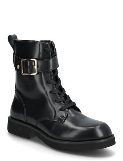 Disse ankelstøvler er fremstillet med en elegant profil og har en markant spænderem og snørelukning. Den flade sål sikrer behagelig brug, hvilket gør dem til en alsidig tilføjelse til enhver garderobe.