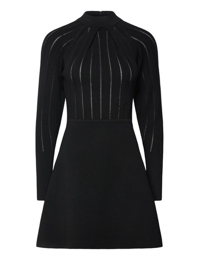 Med subtile, vertikale detaljer giver denne strikkede kjole en raffineret silhuet. De lange ærmer og den høje halsudskæring tilføjer et strejf af elegance, hvilket gør den velegnet til forskellige lejligheder.