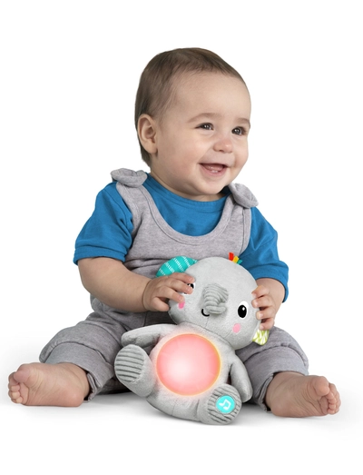 Tilføj en sød glød til natlige rutiner og leg i dagtimerne med Hug-a-bye Baby fra Bright Starts. Den bløde elefant afspiller mere end 20 minutters beroligende melodier og lys med et blidt klem med foden. Skift mellem to afspilningsmetoder til enten kontinuerlig musik eller korte sange. Se, hvordan elefantens mave blinker i takt med melodierne! Din baby vil elske den beroligende glød fra sin nye vens mave. Udforsk de mange teksturer, krusninger og mærker for at fremme udviklingen af finmotorikken. Dette aktivitetslegetøj fungerer også som sut, så du vil få masser af brug for det!