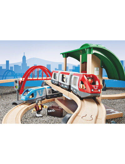 Tag en tur med den blå linje. Dette batteridrevne tog kører dig til stationen, hvor du møder den røde linje. Kør elevatoren op og ned og før passagerne til de rigtige spor. Indeholder 2 tog, 1 bro, bropiller, skilte, figurer, station og skinner. I alt 42 dele. Lokomotivet bruger 1 stk.