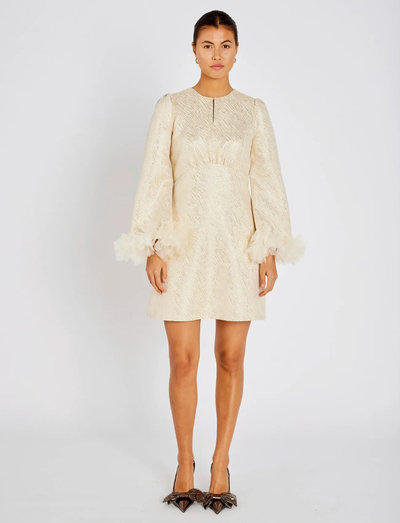 Denne korte kjole har en tekstureret finish og er designet med lange ærmer og fine blomsterdetaljer ved manchetterne. En charmerende tilføjelse til enhver garderobe.