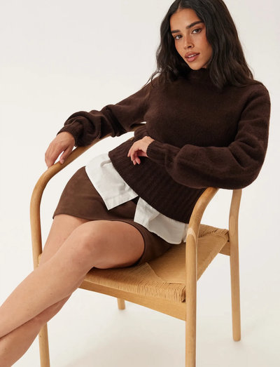 Denne strikkede trøje er fremstillet i en blød og strækbar kvalitet, der sikrer både komfort og stil. Designet har en rund halsudskæring og ribkant ved ærmerne, bunden og halsen. Ærmerne har en flot, voluminøs form, der tilføjer et strejf af drama til silhuetten. Den er delvist fremstillet af genanvendt polyester, hvilket gør dette stykke tøj til et bevidst valg.
