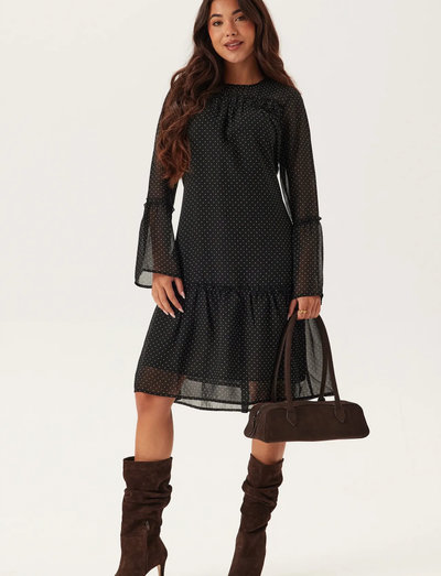 Denne kjole er fremstillet i et let transparent, vævet materiale og har flæsedetaljer foran, bagpå og på ærmerne. Den har en løs pasform og en rund halsudskæring med knaplukning i nakken. Designet fuldendes med et aftageligt bindebånd i taljen og et for.