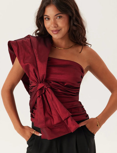 Denne offshoulder-top har en dramatisk sløjfe, der giver et flot udtryk. Smock i ryggen sikrer en behagelig pasform, mens rynkningerne foran bidrager til det visuelle udtryk. Den har også en skjult lynlås i siden.