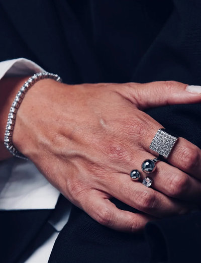 Denne ring har en skinnende 14K guldbelægning og et moderne design med sfæriske perler og en funklende cubic zirconia-sten. Den justerbare ring sikrer en behagelig pasform.