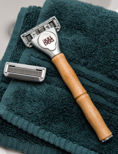 Pakke med 4 barberblade til Bulldog Original Bamboo Razor. 5 stk. hærdede stålbarberblade, smørestrimmmel med fugtgivende aloe vera og præcisionstrimmer til de vanskeligt tilgængelige steder.