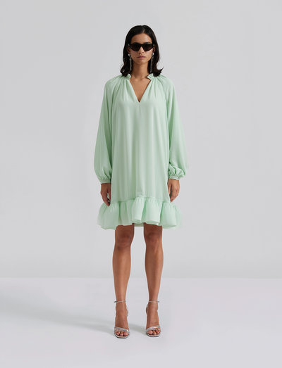 Denne minikjole fra Malina har en flæsedetalje og en V-udskæring. Den er lavet af et blødt og behageligt stof, der er perfekt til enhver lejlighed. Kjolen har en afslappet pasform og er perfekt til et afslappet eller semi-formelt look.