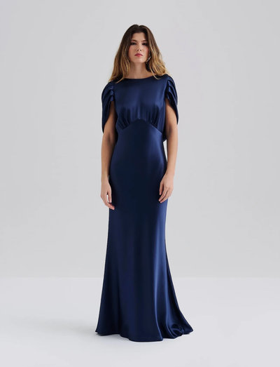 Elegant drapering definerer denne maxikjole og skaber en sofistikeret silhuet. Designet har korte, puffede ærmer og en gulvlang silhuet, perfekt til aftenarrangementer.