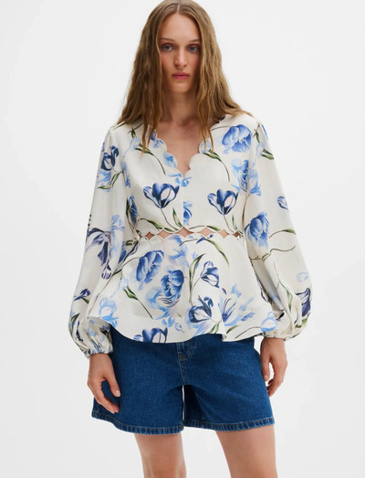 Denne bluse har en karakteristisk peplumkant og er designet med voluminøse ballongærmer. Den udskårne talje og de takkede detaljer tilføjer et elegant touch. Denne top er fremstillet af en blanding af hør og viskose, hvilket giver både komfort og stil.