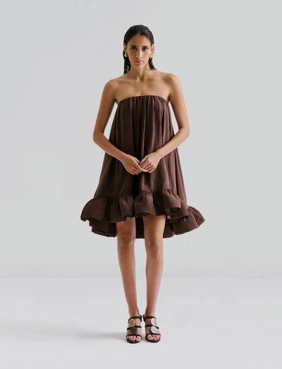 Denne minikjole er stropløs med en flæset kant. Den har en afslappet pasform og er perfekt til enhver lejlighed. Kjolen har et enkelt, elegant design.