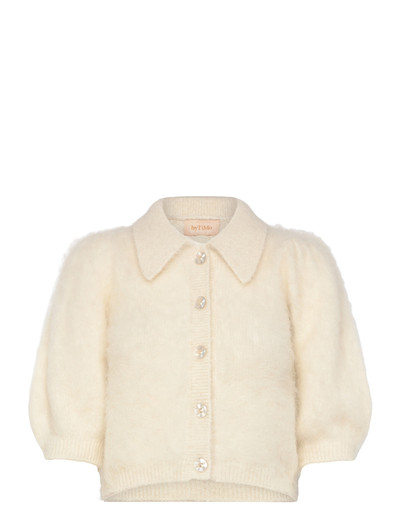 Denne strikjakke er fremstillet af en blød og fuzzy garnblanding og har et cropped og figursyet design. Den har også korte pufærmer med elastiske manchetter, en skjortekrave og ribdetaljer ved manchetter, krave og sømlinje. Jakken lukkes foran med knapper.