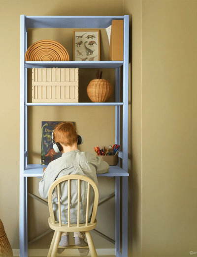 Denne ABC stigereol kalder vi Agger. Den er skabt som et funktionelt møbel med et integreret skrivebord, som kan justeres i højde og hældning. Møblet er lavet i fyrretræ, måler 83cm i bredden og er overflademalet i farven Himalayan Blue. Perfekt til børneværelset eller multirummet. Vælg selv den dybde og højde du ønsker reolen i. Modellen på billedet er 179 cm i højden 40 cm i dybden. Bemærk dog at skrivebordspladen er 60 cm i dybden. Der følger som standard 3 hylder med modellen, men det er muligt at tilkøbe ekstra hylder.