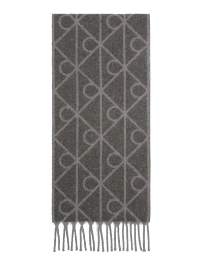 Dette børstede halstørklæde giver varme og stil og har et all-over emblem-mønster. Den bløde fornemmelse og frynserne tilføjer et strejf af elegance til ethvert vinteroutfit.