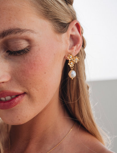 Juni-øreringene er inspireret af sommerens skønhed i fuldt flor og blander delikat blomsterdesign med tidløs elegance. Funklende krystaller sidder i hjertet af indviklede blomstermotiver, der afsluttes med en lysende perledråbe for et sofistikeret touch. De fås i guld- eller rhodiumbelægning og er indbegrebet af midsommerens magi - perfekt til enhver lejlighed. Størrelse: 3 x 2 cm. Designet i Sverige, håndlavet i Grækenland.