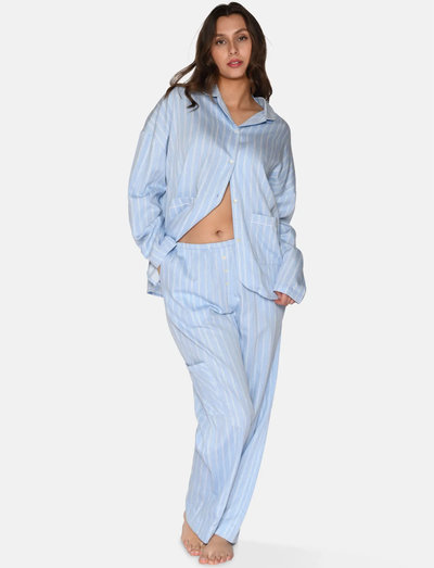 Disse stribede bukser har en afslappet pasform og tilbyder ubesværet komfort. Designet inkluderer en knaplukning foran og en blød elastisk talje, hvilket gør dem ideelle til afslapning eller en god nats søvn.