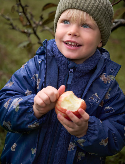 PU rainwear with fleece lining in durable material from CeLaVi. Made of recycled polyester with PU coating. The rainwear is waterproof with a tested water column pressure of 10,000 mm. The set consists of an all-over printed rain jacket and solid colored rain pants. Up to and including size 104, the rain pants are made as overalls with adjustable suspenders and plastic buckle in the front. They can be closed on the side with practical snaps. From size 110 up, the pants are made like pants with elastic at the waist. Both versions have adjustable elastic foot straps that can be put under the boots so that they stay in place. The rain jacket opens at the front with a quality zipper with chin protector and double windpole, of which the outer one closes with practical snaps. The chin protector makes sure that the zipper feels soft under the chin. The jacket has a detachable hood and elastic at the end of the sleeves. Both jacket and pants have soft fleece lining as well as reflective details. It has a name tag inside. Certified acc. to GRS - Made with 51% Recycled Material CERES-0366