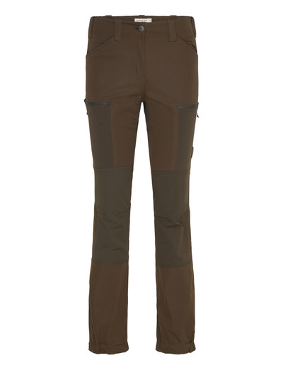 OutdoorDisse jagtbukser til damer er designet til dynamisk bevægelse og er fremstillet af fleksibelt, hurtigtørrende materiale. Ripstop-materiale med 4-vejs stretch ved knæ og sæde sikrer en glat og behagelig pasform. Med et ergonomisk snit, elastisk talje og ventilationsåbninger ved lårene giver disse bukser maksimal bevægelsesfrihed. De har også to cargolommer med lynlåse og en inderlomme til din telefon. Elastiske benafslutninger kan justeres med velcro, og en støvlekrog er skjult inde i den forreste søm.