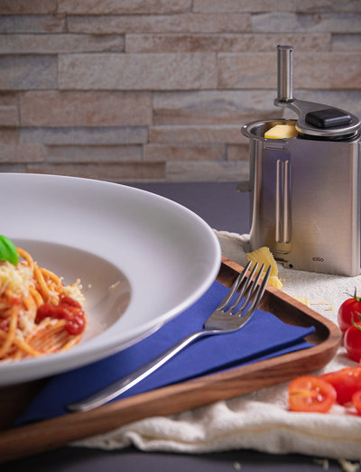 Ostehøvlen kombinerer moderne design med høj funktionalitet. Du skal blot lægge hårde oste som parmesan, grana padano eller pecorino i rivejernet og dreje på det brugervenlige håndsving. Det kompakte rivejern ligger godt i hånden, og man kan ikke se fingeraftryk på det matte, rustfri stål.