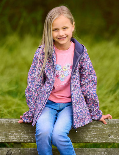 VindtætSoftshell jacket with all-over print from Color Kids. The jacket features reflective details and a water- and dirt-repellent surface. A small fabric protection at the end of the zipper near the chin provides extra comfort. The jacket is equipped with pockets, a fixed hood, and is windproof. The water column pressure is 8000 mm, and the breathability is 3000 g/m². Coated with BIONIC FINISH® ECO. Certified acc. to GRS - Made with more than 50% Recycled Material