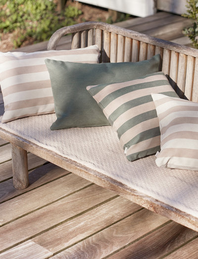 Trendy udendørspude med brede striber i grøn. Match med Outdoor Basic og Fine Stripe puder og indret hyggelige zoner i haven og på terrassen. Outdoor Stripe er lavet i special stof, som er vandafvisende og tåler solens stråler.
