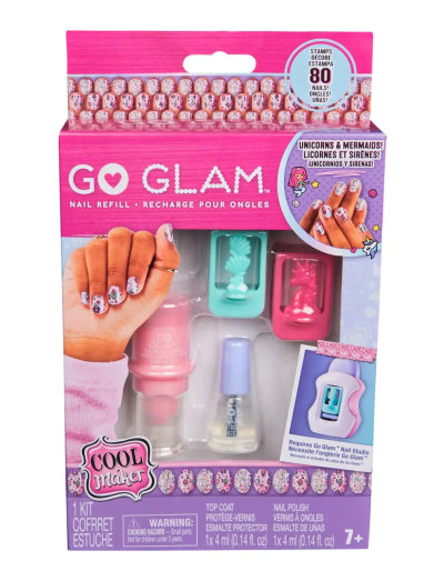 Lav flere flotte og kreative negle med Cool Maker GO GLAM Nail Refill! Sættet er perfekt til børn, der vil designe deres egne seje enhjørninge- og havfrue-manicurer ved hjælp af GO GLAM Nail Studio (sælges separat). Med refillsættets glitrende lyserøde neglelak og 2 sjove designs kan du stemple op til 80 negle i alle størrelser! Sæt en patron i stemplet, luk neglemasken om fingeren, og justér – silikoneovertrækket beskytter huden, så neglelakken kun rammer neglen. Applikatoren er nem at bruge og giver præcis den rigtige mængde farve på hver negl! Efter cirka 4 minutters tørretid er lakken klar til at blive stemplet med dit valgte design. Sæt fingeren ind i stemplet, og se det flotte design blive trykt på neglen! Afslut med en topcoat for en skinnende finish! Uanset om du leder efter fødselsdagsgaver, Gør-det-selv leg eller spændende aktiviteter til sleepovers, spa-dage, skolestart eller regnvejrsdage, er Cool Maker GO GLAM Nail Refill det perfekte valg til kreativ neglekunst!