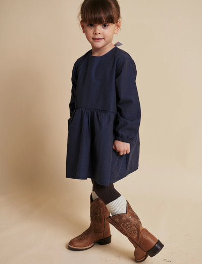 Denne ternede kjole er fremstillet af ren bomuld og giver komfort hele dagen. Den har lange ærmer, en rund halsudskæring og en charmerende sløjfedetalje bagpå.