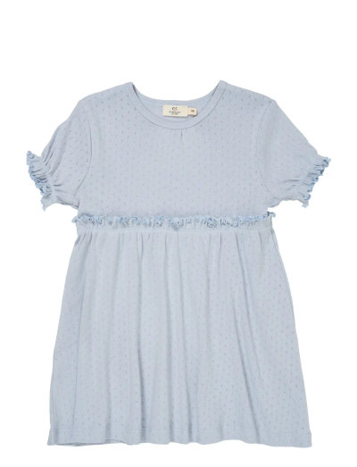 Denne kjole er perfekt til en afslappet dag ude. Den har en behagelig pasform og et stilfuldt design. Kjolen har en rund halsudskæring og korte ærmer med flæser. Nederst på kjolen er der en lagdelt flæsedetalje.