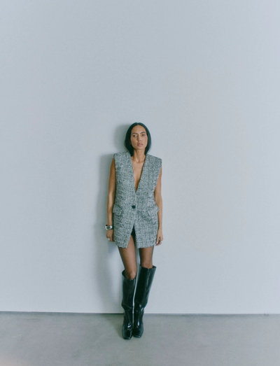 Denne vest er fremstillet i et eksklusivt materiale med en stilfuld, chunky strikket tekstur bestående af sølv- og guldtråde. Vesten har desuden en V-udskæring, brede skuldre, forlommer, en slids bagpå samt et logoprintet for.
