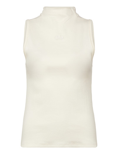 Denne ærmeløse top er fremstillet i et tykt, strækbart ribmateriale, der giver en tætsiddende og flatterende pasform. Den høje halsudskæring tilføjer et sofistikeret touch, hvilket gør den til et alsidigt stykke tøj, der kan bruges alene eller som et lag.