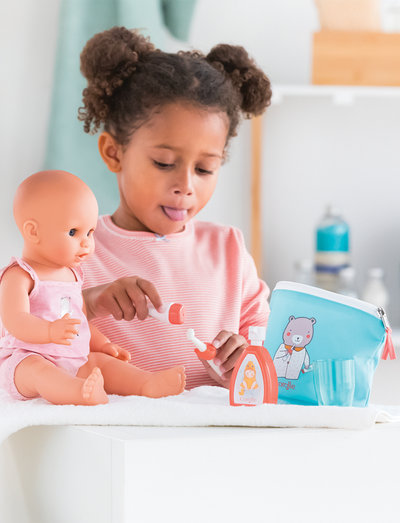 Sæt med 5 stk. badetilbehør til din Corolle-dukke! Sættet indeholder en toilettaske i et flot design, tandbørste, tandpasta, tandbørstekop og sæbe. Alle de medfølgende dele passer perfekt i toilettasken, så du kan tage dem med dig, uanset hvor du går. Sættet fra Corolle passer til alle dukker på 36 cm og er egnet til børn fra 2 år.