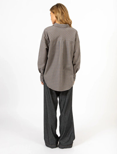 Denne langærmede skjorte har et klassisk ternet mønster og en afslappet, løs pasform. Designet omfatter en knaplukning foran og en let buet kant, hvilket gør den til en alsidig tilføjelse til enhver garderobe.