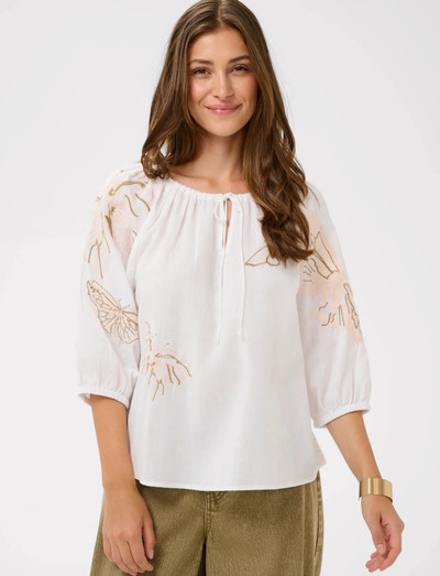 Delikate sommerfugldetaljer løfter denne lette bluse. Den har en yndefuld halsudskæring med fine rynker, et afslappet snit og trekvartærmer, hvilket gør den til en alsidig tilføjelse til enhver garderobe.