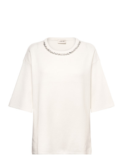 En smule glimmer løfter denne kortærmede pullover. Den runde halsudskæring er udsmykket med subtile, skinnende detaljer, der tilføjer et raffineret touch til den afslappede silhuet. Perfekt til lagdeling eller til at bære alene.
