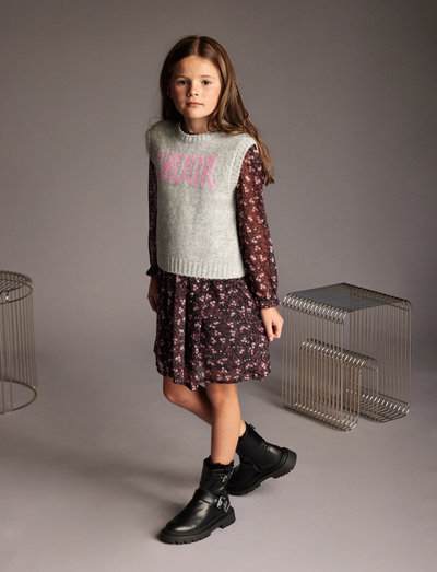 Smart knit slipover with writing on the front from Creamie. It has wide armholes and a round neckline, with a ribbed hem. In the armholes and at the bottom, there are wide ribbed edges. The slipover can be styled over a T-shirt, and is nice and warm on cold days.
