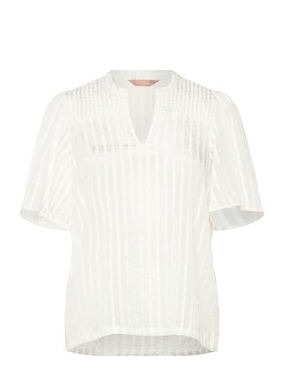 Denne bluse har et subtilt, vertikalt stribemønster, der giver et raffineret look. Designet har en fin, rynket detalje ved bærestykket, hvilket fremhæver det feminine udtryk. De korte ærmer og den afslappede pasform gør den ideel til varmere vejr.