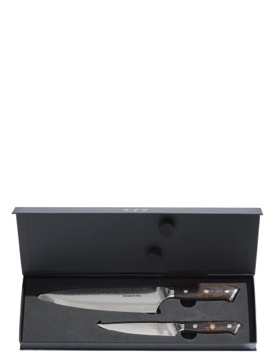 The sharp blade of the Damascus by Hâws Chef knife and Utility knife is made of 67 layers of Damascus steel, ensuring you the best cutting experience. The handle of the knife is designed to fit perfectly in your hand, allowing you to use the knife for extended periods without any problems. Damascus steel is characterized by its beautiful pattern, which arises from a unique forging method where many layers of steel are forged together to create the unique structure. But it's not just the pattern that makes Damascus knives so unique. On the HRC scale, a standard kitchen knife has a hardness of 50-55, whereas Damascus knives have an HRC of 59-60, which is a very high value. A high HRC says a lot about the good quality of the steel as well as its durability. The better the quality of the steel, the longer the lifespan of your knife. With the Damascus by Hâws Chef knife and Utility knife in your kitchen, you can be sure to have knives of the highest quality that hold their sharpness longer than standard kitchen knives. Comes in a beautiful black gift box.