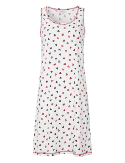 Sleeveless nightdress made from soft cotton jersey with a round neckline. The front features a printed heart motif in contrasting colours. Seams and binding in a contrasting colour add a playful touch and highlight the design. The lightweight, stretchy fabric ensures a comfortable fit – perfect for restful nights and relaxed mornings.
